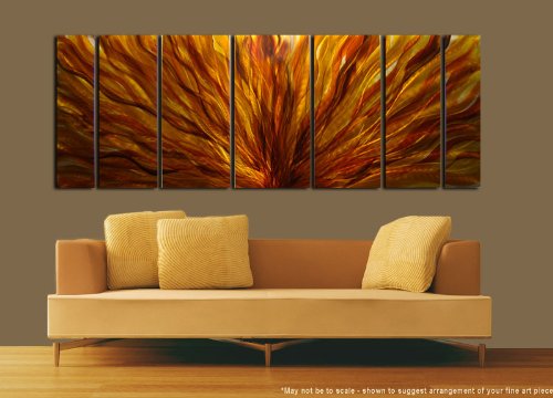 Relax to a soothing down tempo, as the Golden Espresso Brown and Burnt Amber visually play part on your sophisticated earth tone collection. The lumen-dynamics of Jon Allen Metal Art are created by the brushed and polished textures that move with its observer. Interest and curiosity are drawn by the crested Highlights magnified under direct illumination. For lasting beauty and protection, this piece treated to many coats of a glassy Urethane clear-coat. This work is very easy to hang with its pre-installed brackets and a hanging guide tool for proper spacing. Simply, drive a nail or anchor a screw, step back, and enjoy the view...Modern Abstract Art Home Decor"Fall Plumage" Modern Abstract Metal Wall Art Painting Decor By: Jon Allen Review
